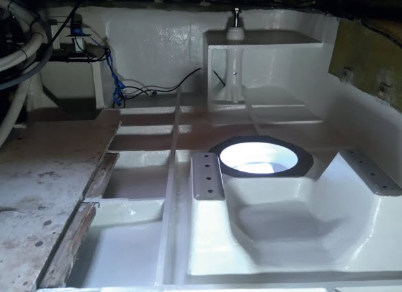 2. Once the batteries and floor were removed the rudder and saildrive bed could be measured, aligned and glassed in.